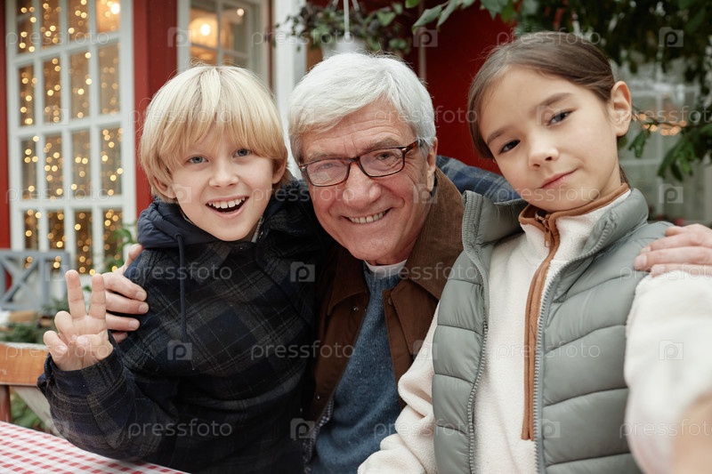 Портрет пожилого человека, обнимающего внуков и улыбающихся на улице