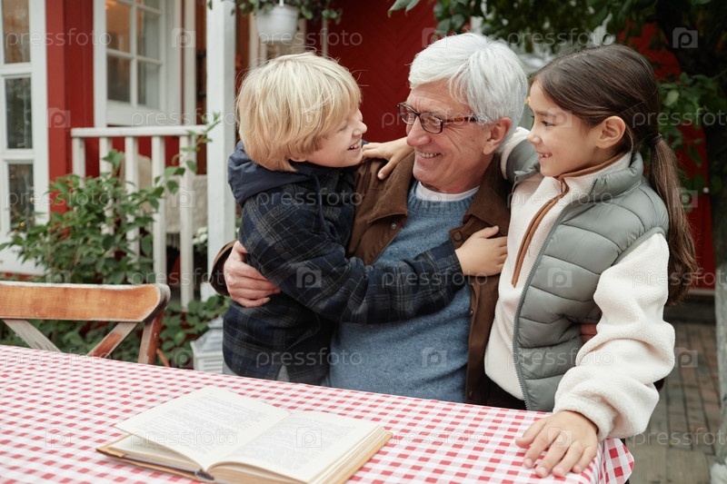 Старший мужчина обнимает внуков, улыбаясь вместе на открытом воздухе