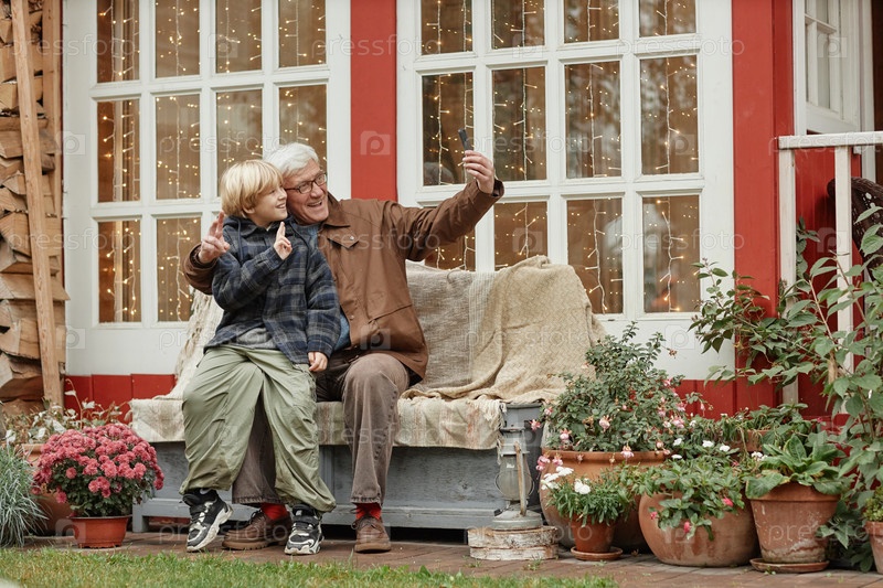 Старший мужчина делает селфи с внуком за пределами деревенского дома
