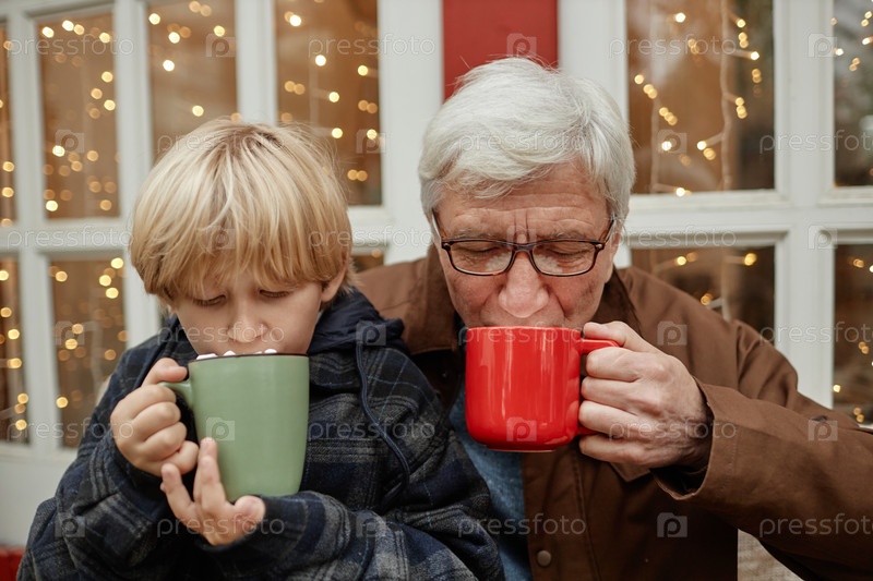 Старший мужчина и молодой внук пьют горячие напитки вместе