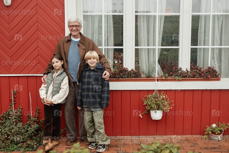Старший мужчина, стоящий с внуками и улыбающийся снаружи деревенского дома