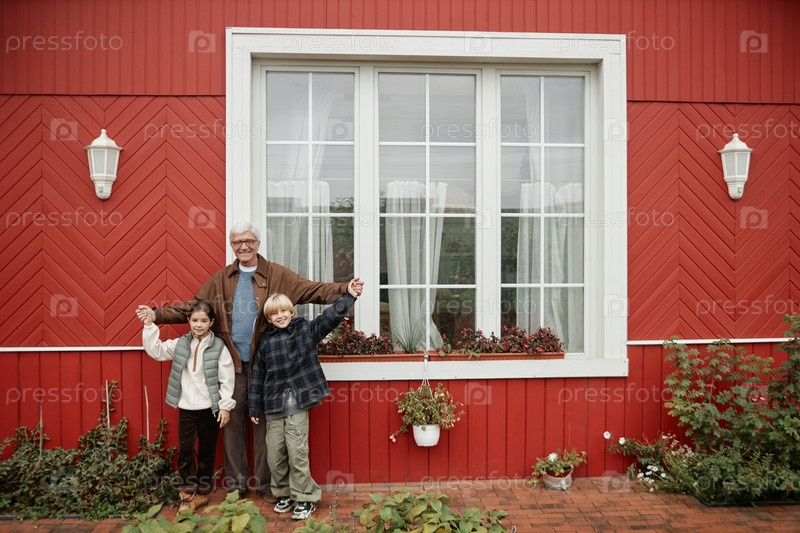 Старший мужчина, держащийся за руки с внуками улыбаясь от Красного дома