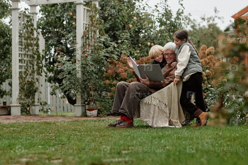 Старший мужчина читает книгу с внуками на открытом воздухе в деревенском саду