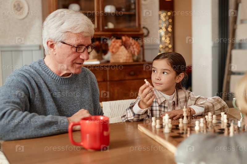 Мужчина играет в шахматы с внуками в домашней обстановке