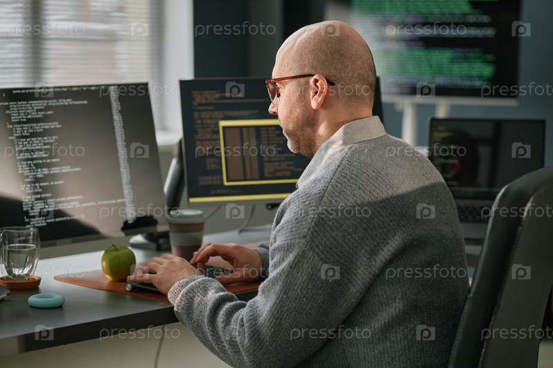 Человек среднего возраста печатает код на нескольких мониторах в солнечном рабочем пространстве