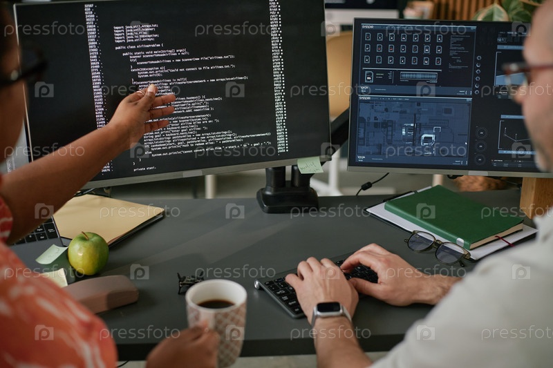 Мужчина средних лет сотрудничает с чернокожей женщиной по компьютерному программированию