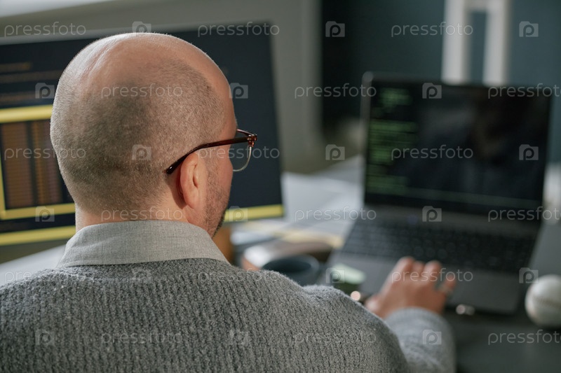 Мужчина средних лет работает на ноутбуке в современном офисе