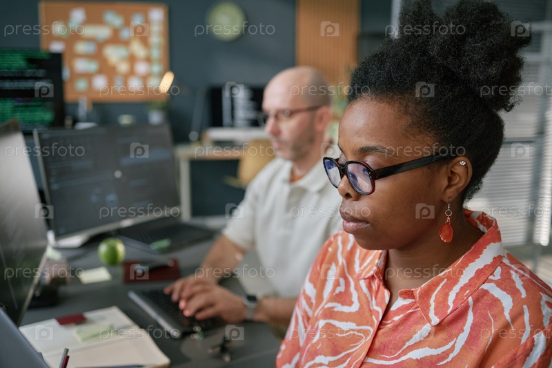 Молодая чернокожая женщина работает на компьютере рядом с мужчиной средних лет