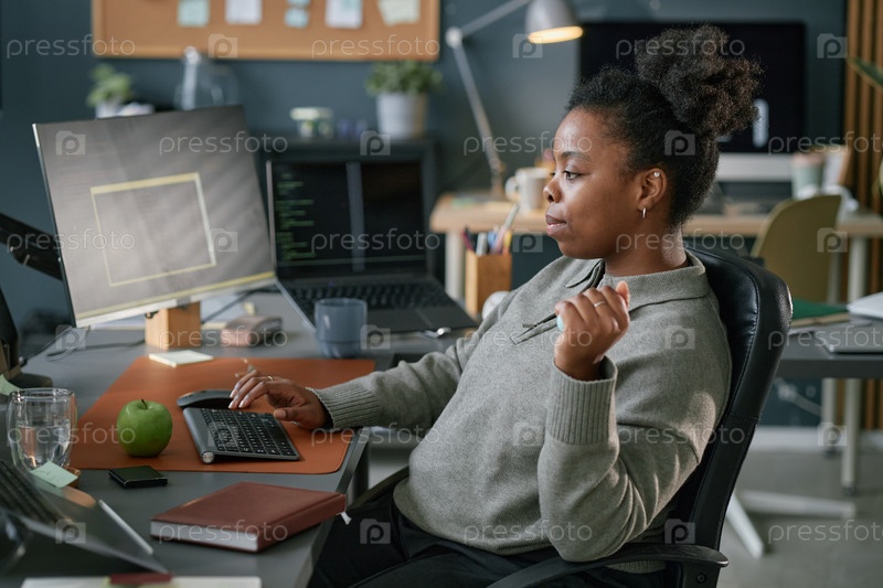Молодая взрослая чернокожая женщина работает на компьютере в современной офисной среде