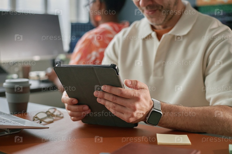 Мужчина средних лет использует цифровой планшет в современном офисном рабочем пространстве