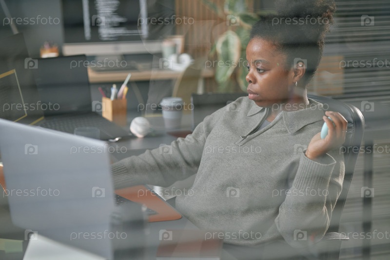 Молодая чернокожая женщина работает на ноутбуке в современной офисной среде