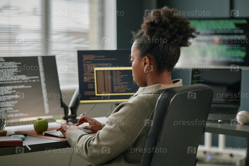 Молодая взрослая чернокожая женщина работает на компьютере в современной офисной среде