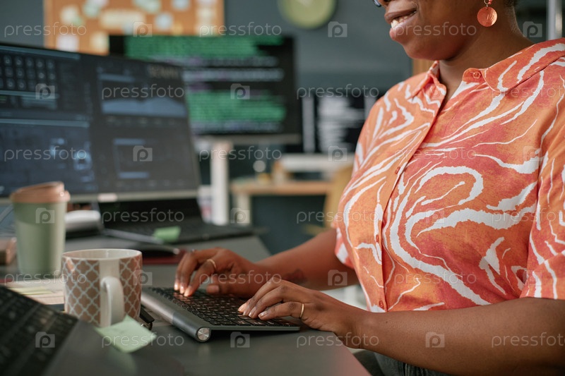 Молодая взрослая черная женщина улыбается, вводя данные на беспроводной клавиатуре