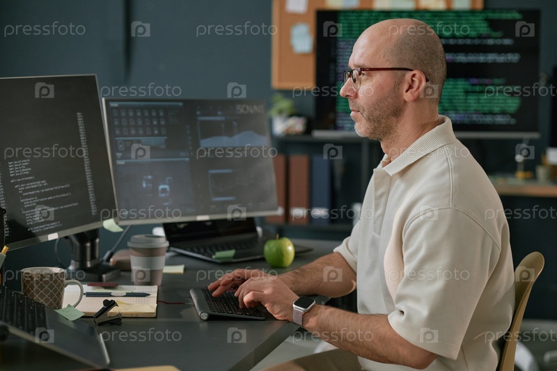 Мужчина среднего возраста анализирует данные на нескольких экранах компьютера за рабочим столом
