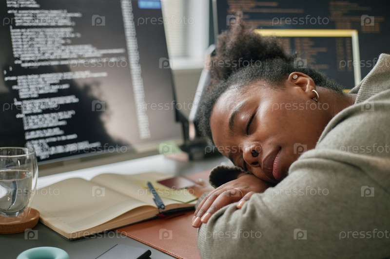 Молодая чернокожая женщина спит за рабочим столом, окружена компьютерными мониторами и ноутбуком