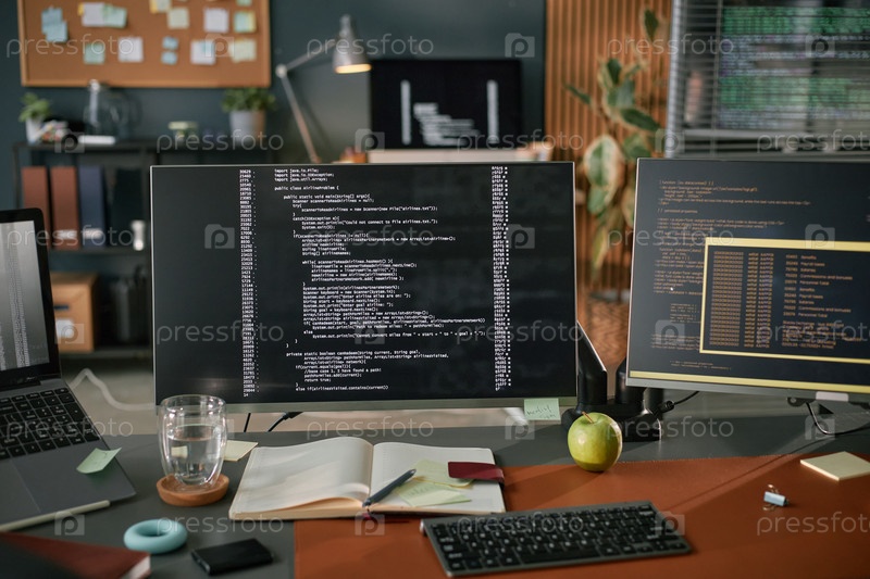 Близкий взгляд на компьютерный монитор, отображающий программный код в современном офисе