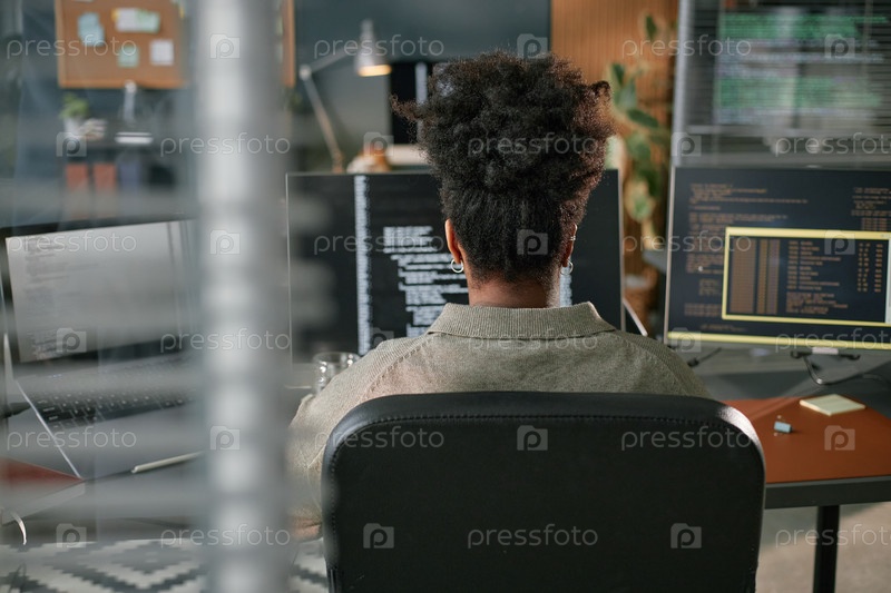 Молодая чернокожая женщина работает над компьютерным программированием в современном офисе