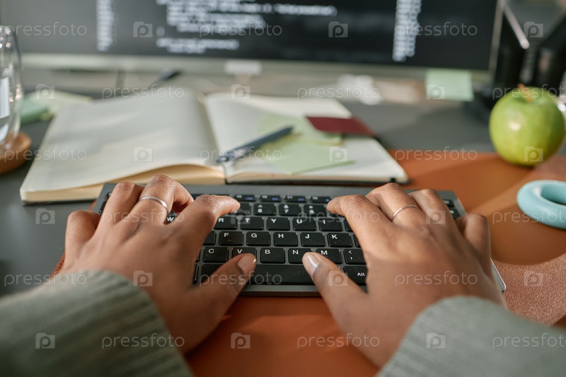 Молодая взрослая чернокожая женщина печатает на беспроводной клавиатуре, работая за рабочим столом