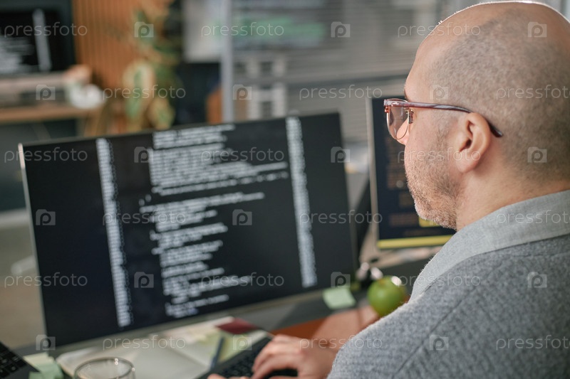 Мужчина среднего возраста просматривает программный код на большом мониторе в офисе