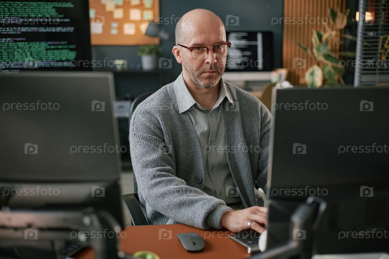Портрет мужчины среднего возраста, фокусирующегося на задаче по разработке программного обеспечения