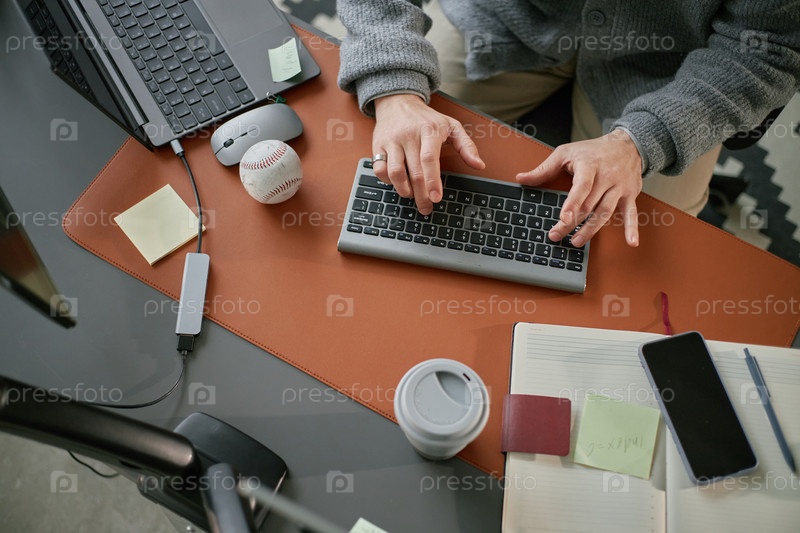 Мужчина средних лет печатает на беспроводной клавиатуре, работая удаленно