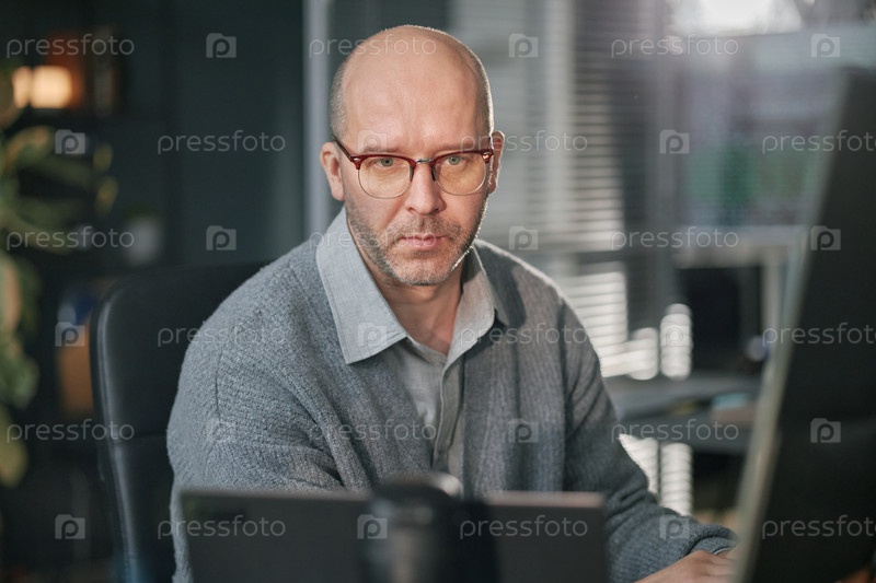 Портрет мужчины среднего возраста с очками, работающего за компьютером