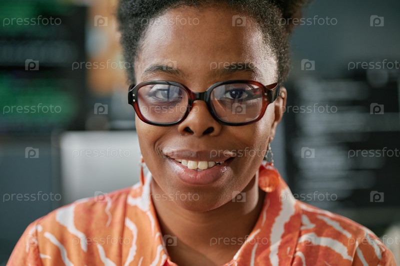 Портрет молодой взрослой чернокожей женщины, улыбающейся и смотрящей в камеру