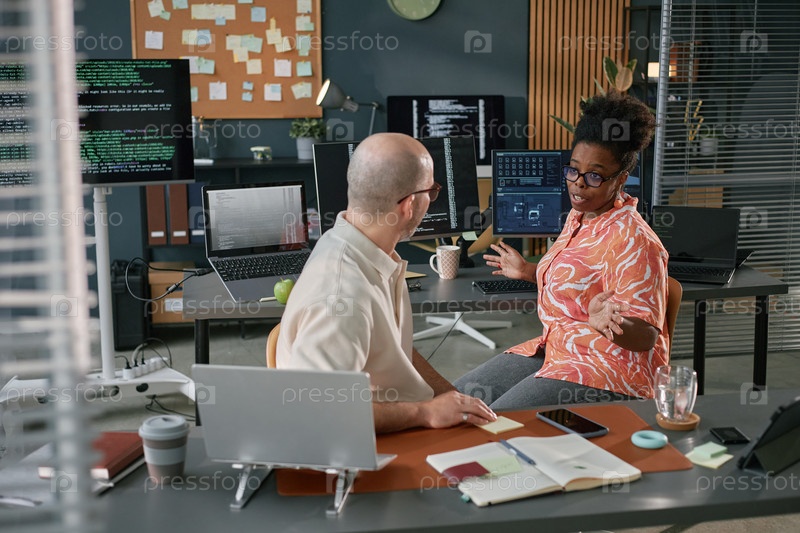 Мужчина средних лет и чернокожая женщина обсуждают проект по разработке программного обеспечения