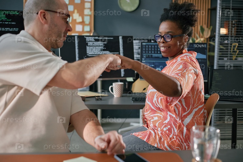 Молодая чернокожая женщина и мужчина среднего возраста бьют кулаками, сотрудничая