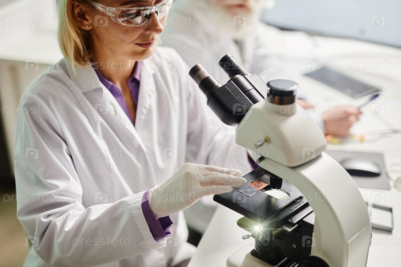 Женщина среднего возраста позиционирует слайд на микроскопе в лаборатории
