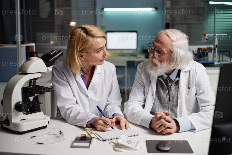 Молодая взрослая женщина консультирует мужчину средних лет в лаборатории