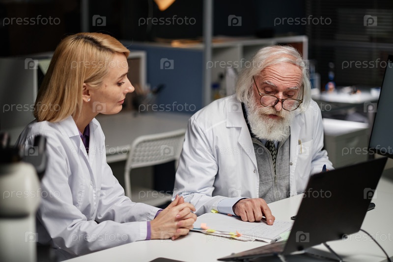 Старший мужчина и молодая взрослая женщина анализируют исследовательские данные