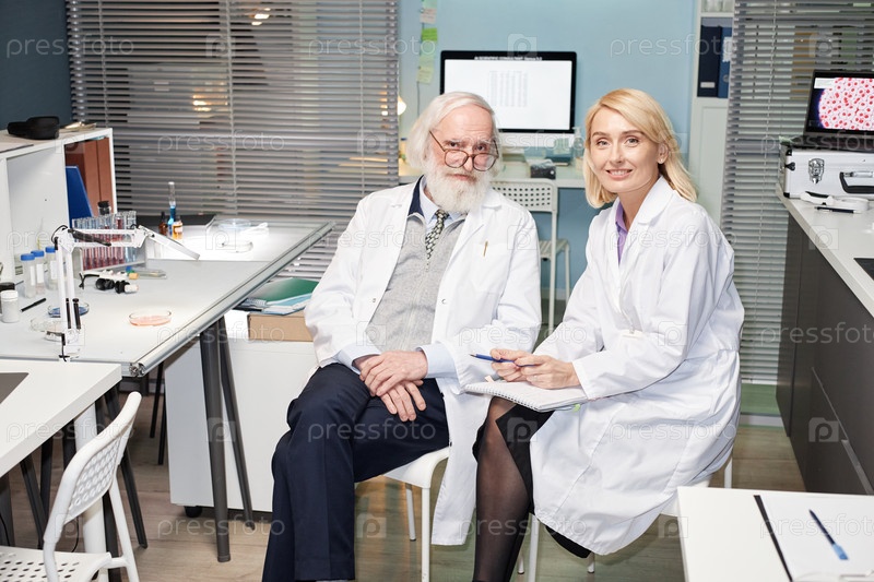 Портрет пожилого человека и женщины среднего возраста, позирующих в лаборатории