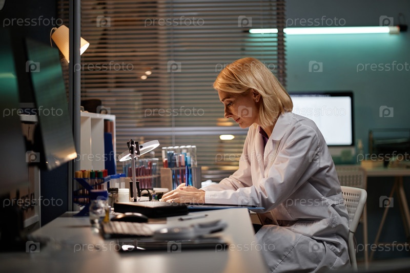 Женщина среднего возраста анализирует образцы в научной лаборатории