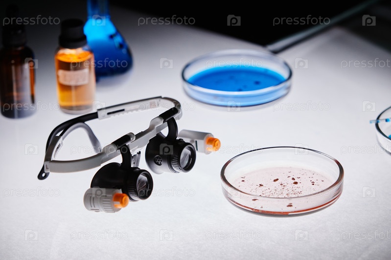 Лабораторные очки безопасности и тарелки Петри с научными экспериментами