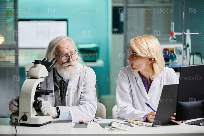 Старший мужчина и молодая взрослая женщина обсуждают результаты исследований