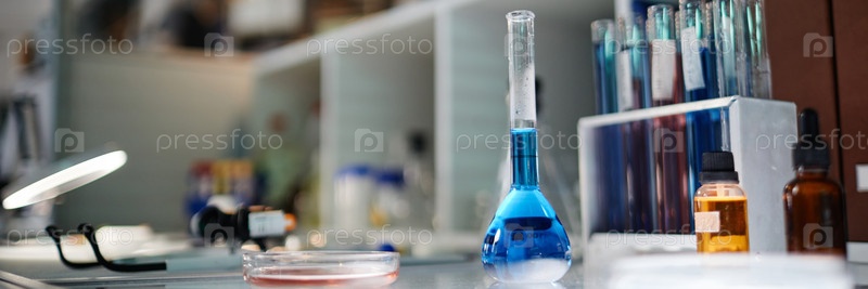 Заголовок изображения лабораторного стеклоизделия с синей жидкостью, стоящей на рабочей скамейке