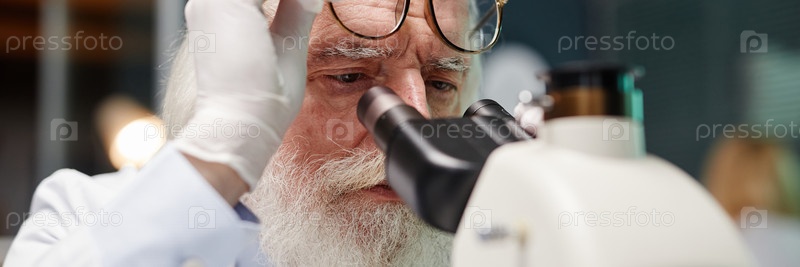 Заголовок изображения пожилого человека, регулирующего очки во время наблюдения с помощью микроскопа