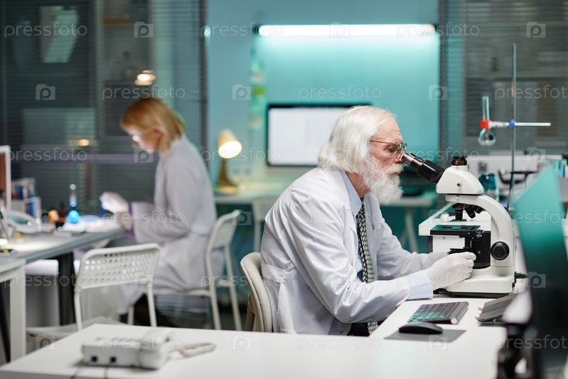 Старший мужчина изучает образец с помощью микроскопа в научной лаборатории