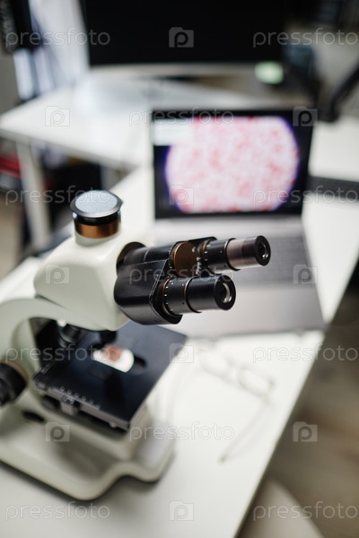 Ближайший снимок микроскопа с помощью компьютера, отображающего образец клетки в лаборатории
