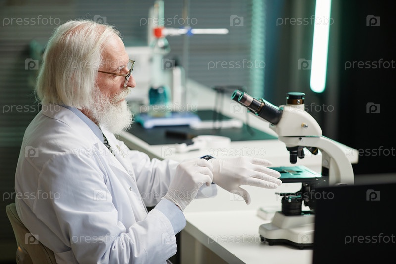 Мужчина в перчатках готовит слайд для микроскопического обследования