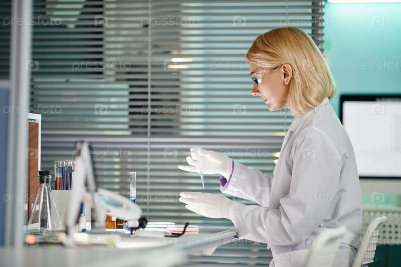 Женщина среднего возраста проводит научный эксперимент в лаборатории