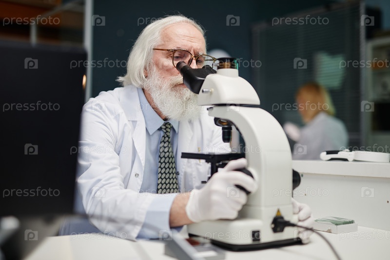 Старший мужчина, носящий лабораторное пальто сфокусированный микроскоп в лаборатории