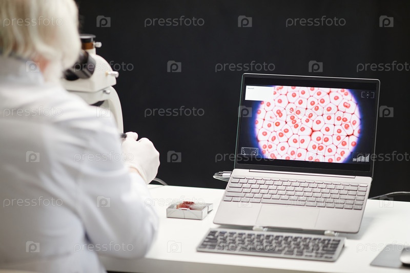 Женщина, анализирующая образцы клеток с помощью микроскопа и ноутбука