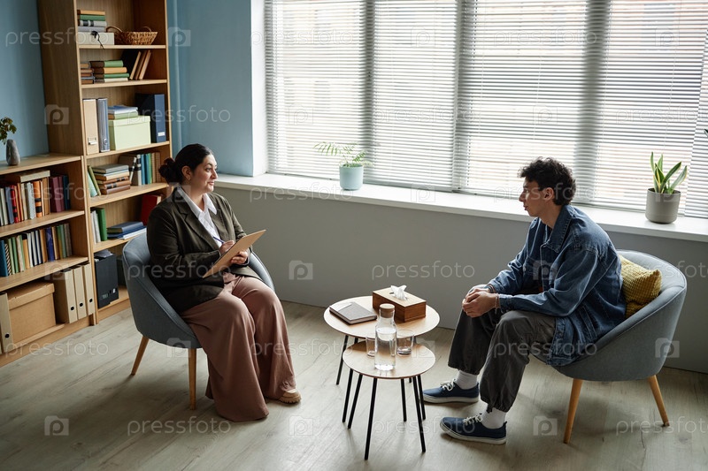 Мальчик-подросток посещает консультационную сессию с женским терапевтом в помещении