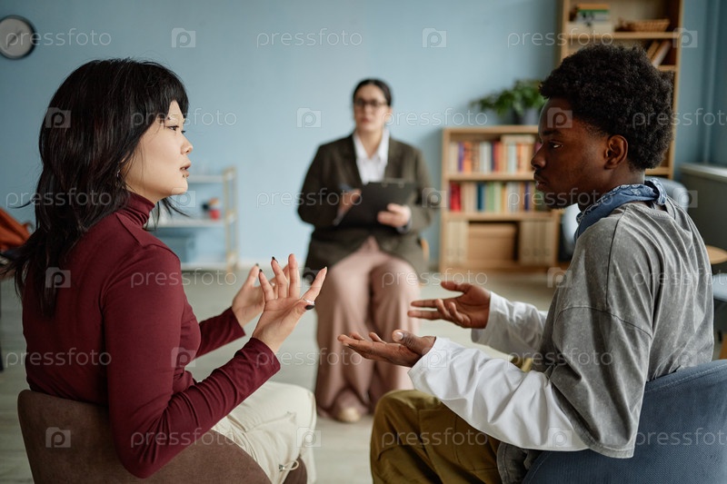 Мультиэтнические подростки обсуждают проблемы во время консультационной сессии в помещении