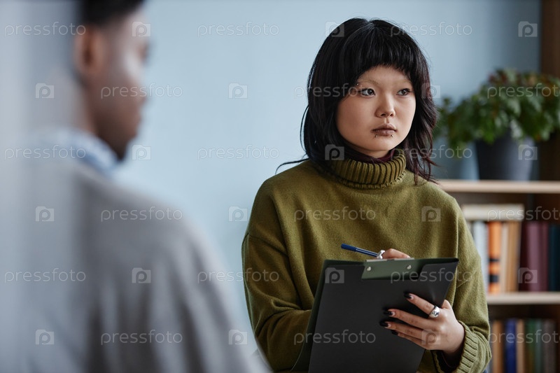 Азиатская девочка-подросток внимательно слушает во время консультационной сессии в помещении