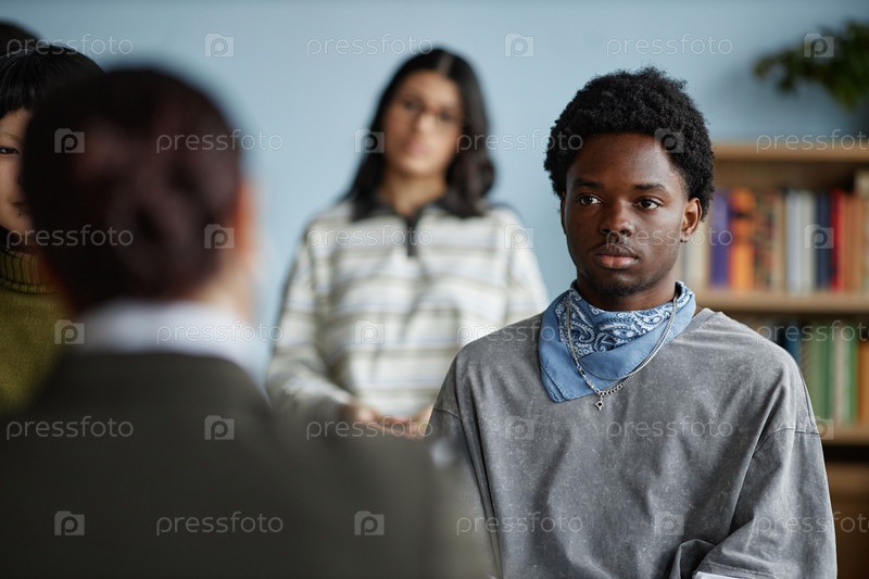 Черный подросток посещает консультационную сессию с разнообразной группой подростков
