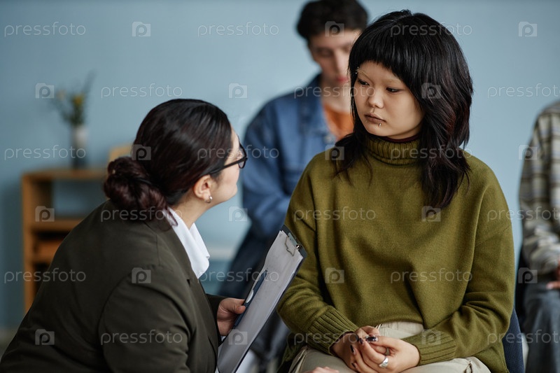 Азиатская девочка-подросток посещает консультационную сессию с слушающейся терапевтом