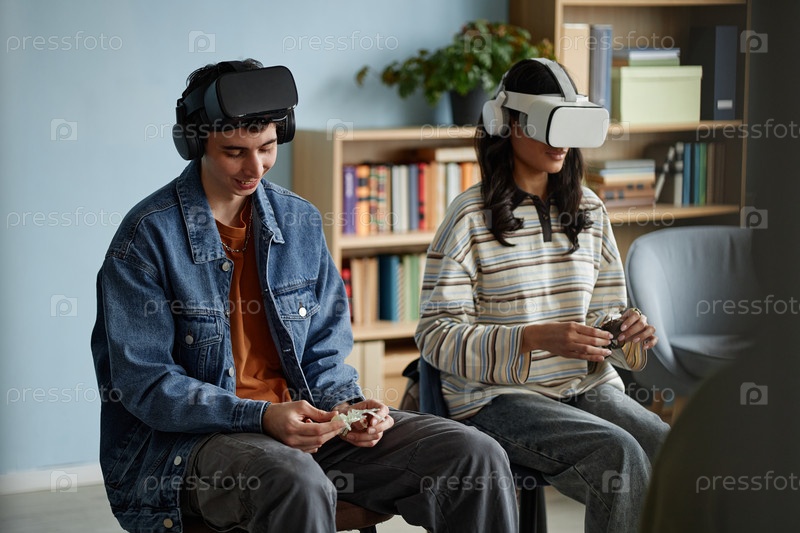 Мультиэтнические подростки, испытывающие виртуальную реальность во время консультационной сессии